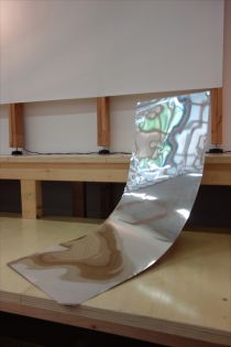 The curved plate entitled Lost and Found reflects the space and also shows the reflection of the viewer, both distorted and multiplied. Because of the size of the plate Lost and Found can only be experienced by one person at a time.