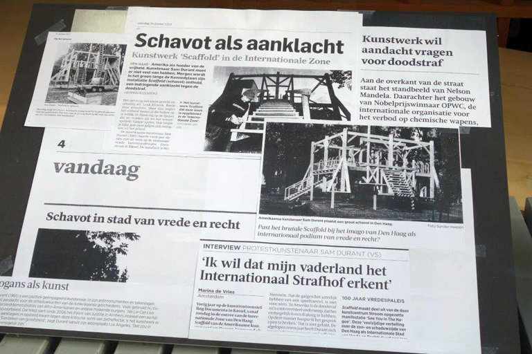 Scaffold, a sculpture by the American artist Sam Durant, is a combination of reconstructed wooden gallows (or scaffolds as they were once called) that were used in executions of significance throughout U.S. history, from abolitionist John Brown in 1859 to Saddam Hussein in 2006. In concurrence with the program See You in The Hague, the work will be literally activated as a platform for discussion about the death penalty, democracy, national administration of justice and international criminal law. A public program will turn Scaffold into a platform for discussion and reflection.