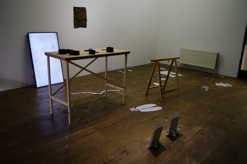 On a daily basis two original drawings from the series will be presented in the Ondertussen space. After 38 days all drawings will have been shown. There will be objects and markings on the floor that refer to the imaginary space depicted in the drawings. These interventions create an entrance into the imaginary studio.