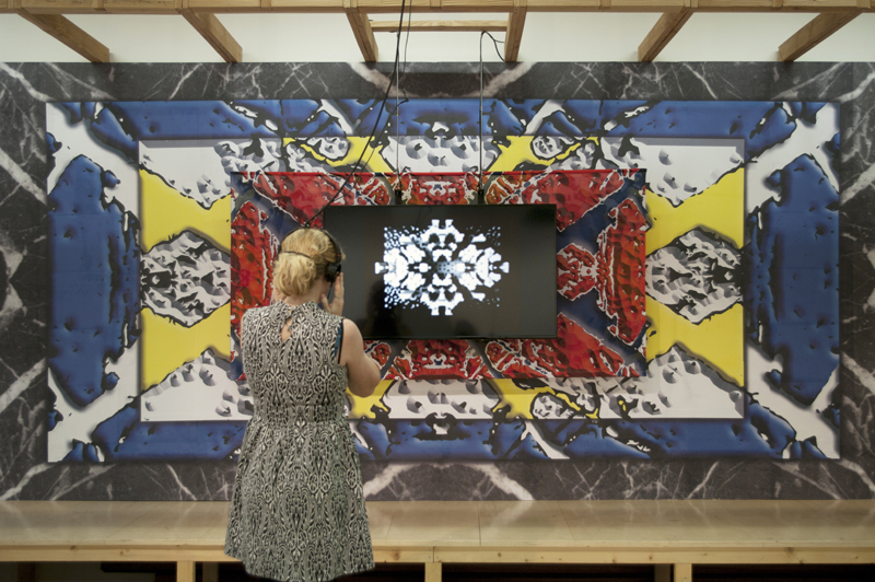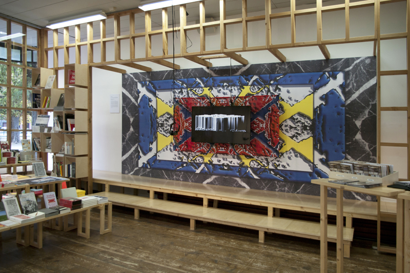entreeruimte van Stroom Den Haag. Het wandmeubel dient als podium en