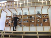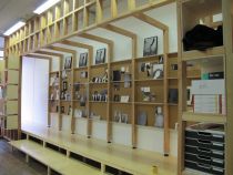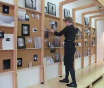 entreeruimte van Stroom Den Haag. Het wandmeubel dient als podium en