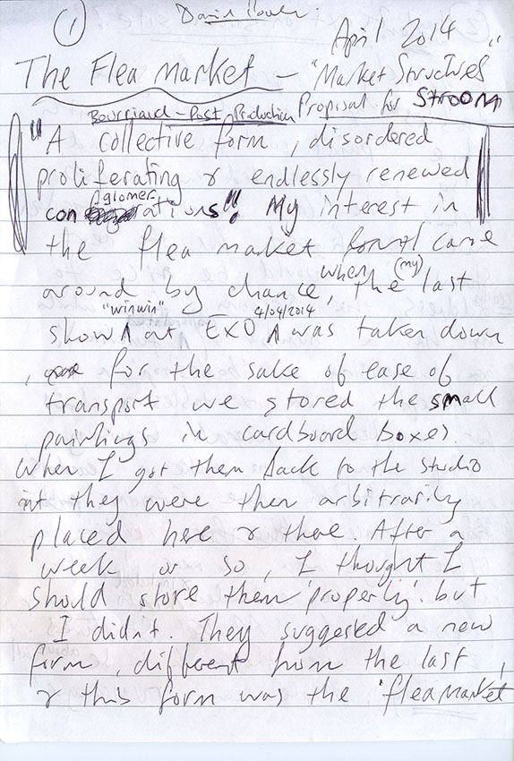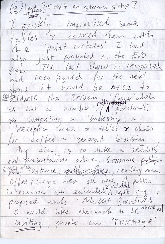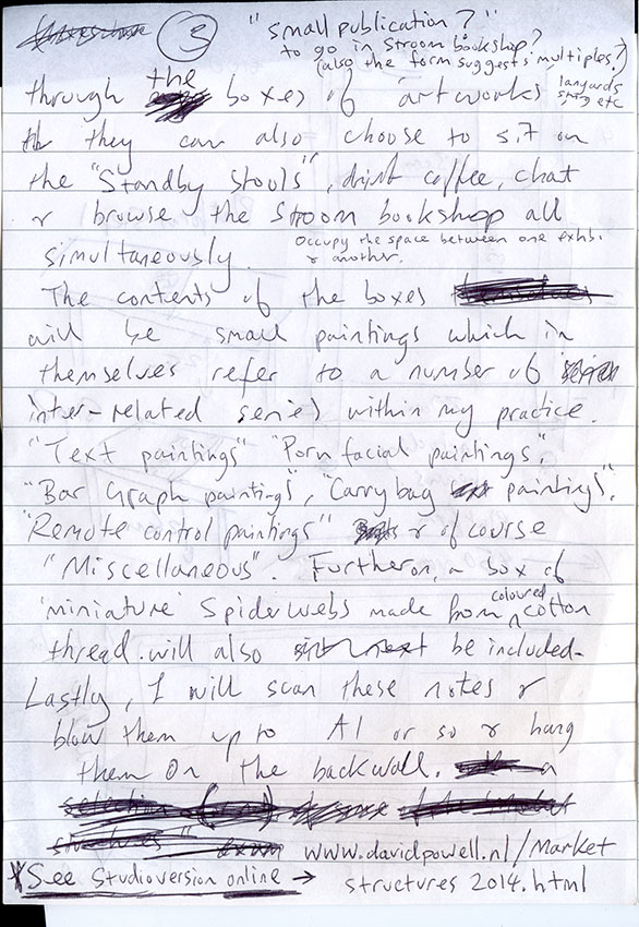 For my presentation at Stroom Den Haag, I will bring a mini flea market into the space that comprises mostly small paintings, works on paper and some miscellaneous pieces, some of which were recently exhibited in my last show at EXO in Den Haag. The work is titled Market structures and this will be its first incarnation. The entry space at Stroom has a number of functions that typify independent art spaces, there is a bookshop with an adjacent browsing area with coffee, tables and chairs along with an information desk. Within this structure is a temporary display area where artists are invited to do something. My aim then with Market structures is to create a more fluid dialogue with these functional aspects of Stroom's entrance by encouraging people to ‘rummage' through my work.
