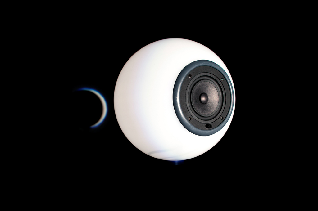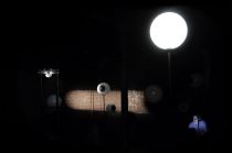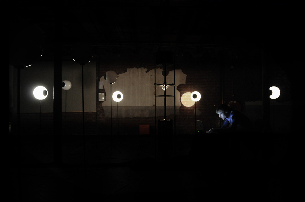 In the installation 'Score' this principle takes on a mechanical form; timing and touch are made visible through light and movement. In the space sixteen white bulbs stand in a circle of six meters in diameter. Each bulb contains a speaker, a light sensor and a light source. In the center of the circle there is a rotating beam of light generated by a computer. When the light source illuminates one of the bulbs, the bulb in question produces a sound. By making the light source rotate faster or slower, more complex and varied rhythms can be produced. The intensity of the light determines the loudness of the sound. By means of the light sources in the bulbs themselves a certain note can be held; thus chords can be created in space.