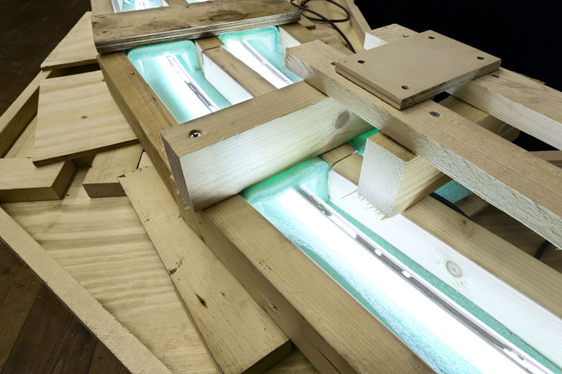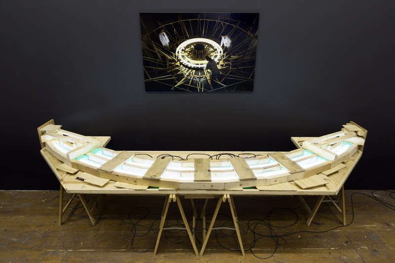 In the Ondertussen space the artist Thijs Ebbe Fokkens (lives and works in The Hague) shows objects, photographs and other traces, that document the site specific projects he created between 2010 and 2013 with the support of a Stroom PRO grant. It concerns the following projects: Bringing coherence to the mystery in De Fabriek (Eindhoven, 2010), TOO BIG TO FAIL in De Overslag (Eindhoven, 2011), Hole in One in Kunstverein Leverkusen (2012) and The Aleph in Kunsthal KAdE (Amersfoort, 2013).