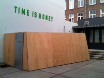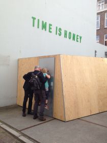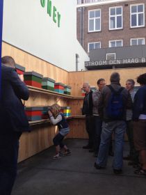 The Queen Bank, the Treasury of the Honey Bank, is is an artwork consisting of a wooden object in which 20 wonderfully coloured beehives are situated. In this Treasury twenty queens and some 200.000 bees are raised. In each hive lives one queen with her own bee colony. The Queen Bank is managed by Hague bee-keepers and primarily financed by Bee Savers with a Bee Savings Account and Bee Ambassadors. From Friday June 22, 2012 the Queen Bank is situated in Stroom's backyard in the Maziestraat (off Noordeinde).