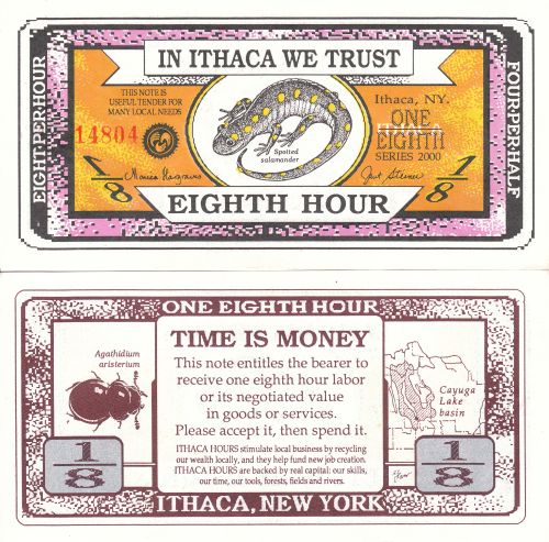 Ithaca Hours is a local currency system that promotes local economic strength and community self-reliance in ways which will support economic and social justice, ecology, community participation and human aspirations in and around Ithaca, New York. Ithaca Hours help to keep money local, building the Ithaca economy. It also builds community pride and connections. More than 200 businesses publicly accept Ithaca Hours for goods and services (including the best restaurants in town, movie theaters,