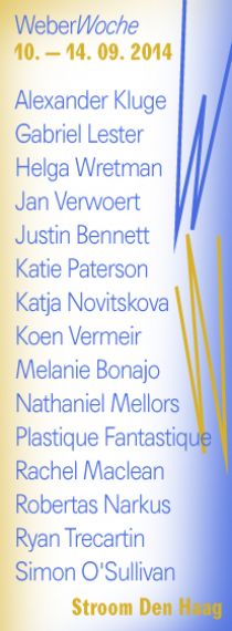 WeberWoche presents contributions by Alexander Kluge, Gabriel Lester, Helga Wretman, Jan Verwoert, Justin Bennett, Katie Paterson, Katja Novitskova, Koen Vermeir, Melanie Bonajo, Nathaniel Mellors, Plastique Fantastique, Rachel Maclean, Robertas Narkus, Ryan Trecartin, Simon O'Sullivan.