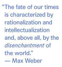 ‘The fate of our times is characterized by rationalization and intellectualization and, above all, by the 'disenchantment of the world.' Precisely the ultimate and most sublime values have retreated from public life either into the transcendental realm of mystic life or into the brotherliness of direct and personal human relations.'