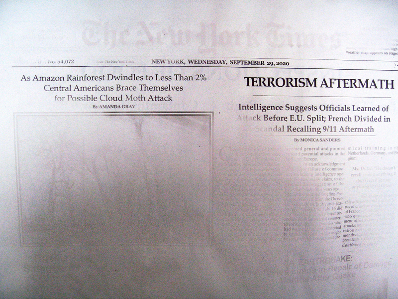 Een versie van de New York Times van het jaar 2020 samengesteld uit berichten van een professionele helderziende en geschreven door NYT journalisten, een verzameling van boeken die enkel bestaan als vermeldingen in andere boeken, conceptuele kunstwerken die tot nu toe alleen bestonden als suggesties, een soundtrack van stiltes uit beroemde speeches, werken van inkt die verdwijnt en verschijnt afhankelijk van het weer, een film met personages die werden weggehaald uit Hollywood films, een zwevende meteoriet.