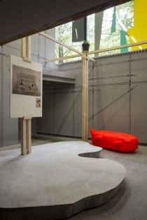 Mike Cooter maakt een betonnen ‘podium' voor de tentoonstelling; een weerspiegeling van de wolkachtige, antropomorfe raamopeningen die Bo Bardi introduceerde. Cooter ziet het als een monument voor haar aandacht voor het sociale en haar organische interventies in rigide systemen.