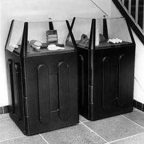 Plastic showcases containing a number of difficult to define objects made from every day utensils (1993, edition of 4).
