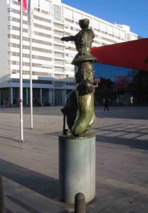 De kunstenaar maakte dit sokkelbeeld als een reactie op de vele beelden