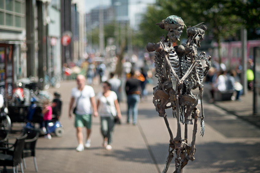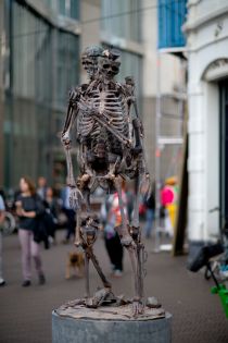 De Jong became fascinated by a finger and tongue belonging to the De Witt brothers, now located in the Hague Historical Museum. According to tradition the brothers were shot, stabbed, butchered and partly eaten in front of the Prison Gate in The Hague, before they were hung. Parts of the bodies of the murdered brothers were taken as trophies and sold, as were the finger and tongue which eventually ended up in the museum. For the sculpture the artist converted two lifelike synthetic skeletons to bronze: symbols of transience, an important theme in 17th centruy art. The skeletons seem to merge into one figure. De Jong wants to transcend the literalness of these atrocious events.
