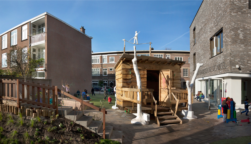 The school buildings were designed by Atelier Pro and include two eco-friendly, green schoolyards, designed by the parents.