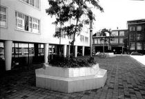 On the square of the new student housing behind the Institute of Social Studies, one of Europe's most important institutions for higher education and research in developing countries, Van Golden wanted to create a Mediterranean atmosphere in terms of material and furniture. He arranged the space so that three trees could grow on the patio, and thus newly created square, and designed three benches of ocre yellow ceramic tiles that also serve as tree pots. For the pavement of this square, which is actually the roof of the parking garage, he chose bricks in two colors that were laid in an ingenious pattern and had silver colored lampposts installed.