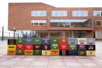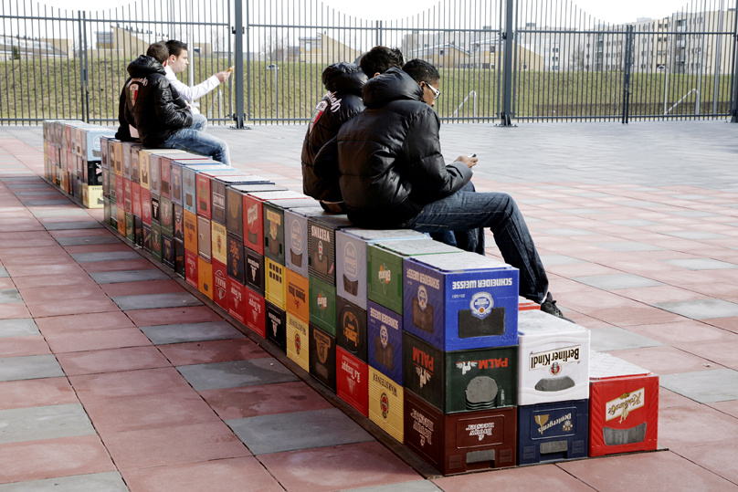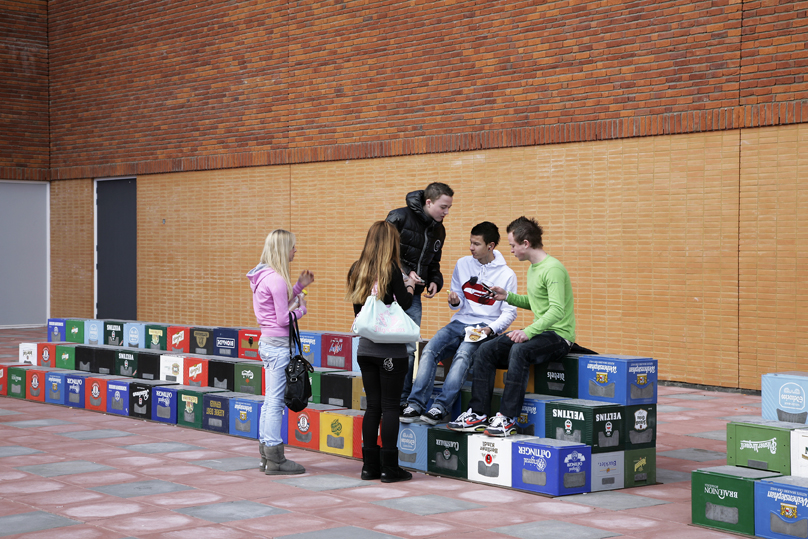 Bij het 's Gravendreef College lijkt het of er net een feest is afgelopen, of dat het juist gaat beginnen.. Op het enorme schoolplein van het nieuwe ‘s Gravendreef College bouwde Hester Oerlemans een tribune van honderden gestapelde bier- en limonadekratjes. De kratjes staan op hun kop en zijn volgestort met beton. Hierdoor wordt de bodem glad (en fijner om op te zitten), maar blijft het patroon zichtbaar. Het kratje krijgt een nieuwe functie: zijn herkomst is nog wel te zien maar de verschillende kleuren, stapelingen en de diverse aaneenschakelingen van patronen maken het een uniek beeld.