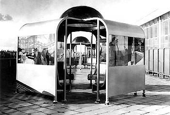 4 steel pavilions with red and blue light domes and transparent walls made up of photomontages