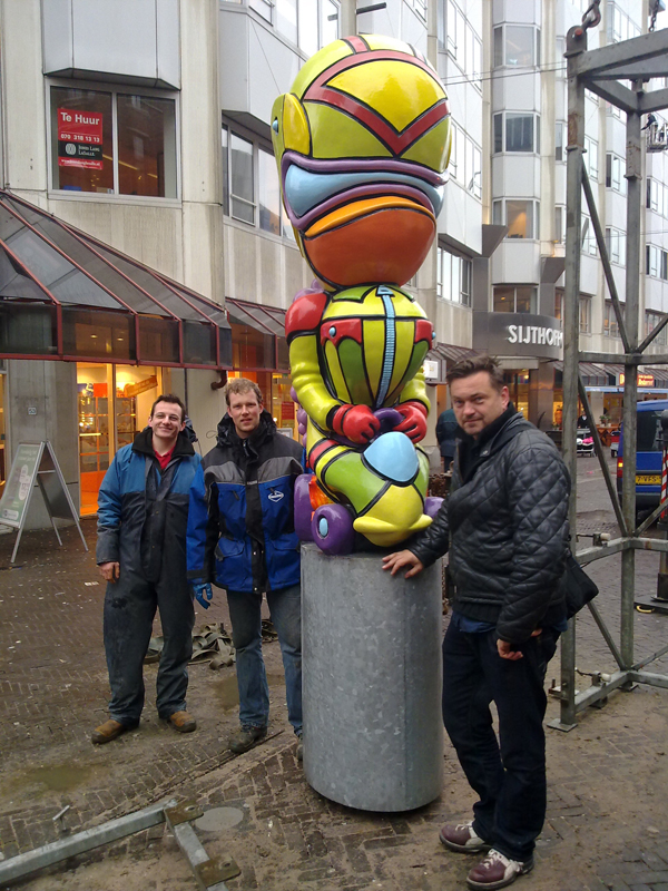 Even though you can see the sparks fly from under his cart, this racing space duck doesn't go into a skid: the wheels stay safely within the confines of the pedestal. He could easily be a character from a weird science fiction comic. No wonder, because Hans van Bentem (1965) is fascinated by popular culture, like comic strips and street art. But he chose ceramics to produce this contemporary figure, an age-old material that has been used by mankind for many centuries. Obviously, the past is Van Bentem's second muse.