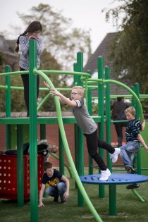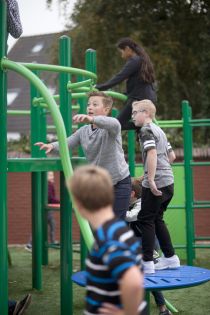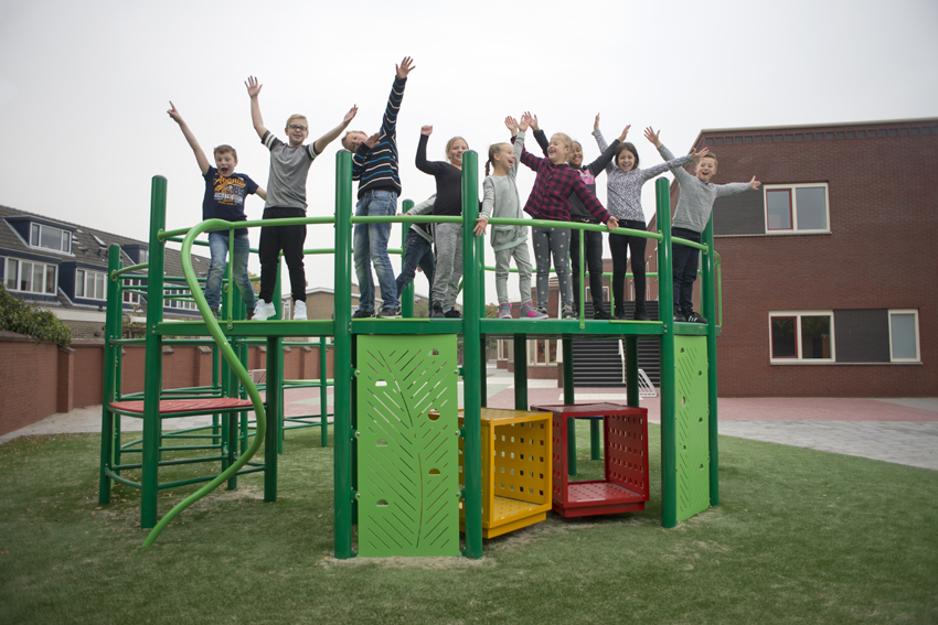 Decisions about how to use the available space for an art commission are not always easy to make. Inside a school building there are many interfering objects, like coat racks, fire hoses and lamps. They make the space look much smaller than on the blueprints. And the outdoor space too is often full of playground equipment and street furniture. Some time ago already the students of the Ds. W.E. den Hertogschool expressed a wish for new playground climbing equipment. They even organized a marathon to collect the necessary funds. Children of various ages were elected to be part of the Art Committee. They selected Izabela Boloz, an artist/designer who was born in Poland, but who lives and works in the Netherlands, after graduating from the Design Academy in Eindhoven.