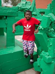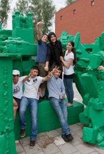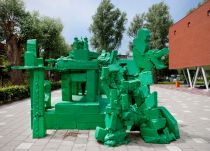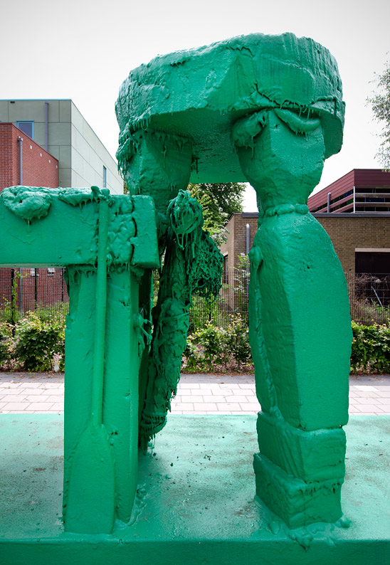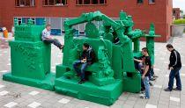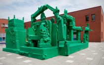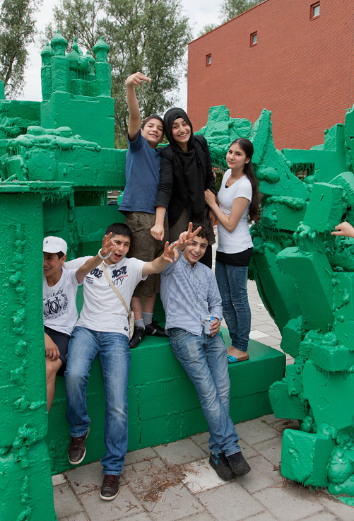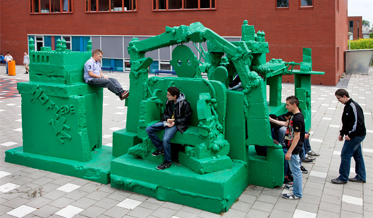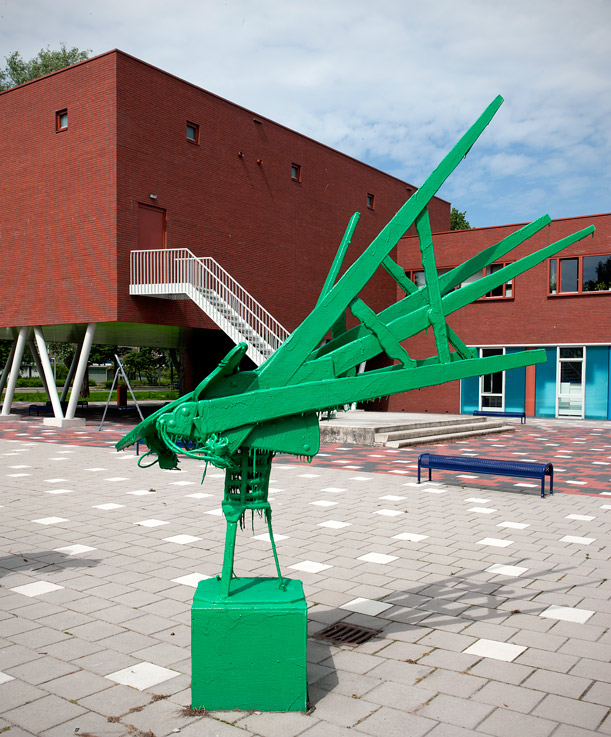 The huge public art work 'Fix Adem Vrij' by David Bade was created in collaboration with the pupils of the Hofstedeschool, students of the art academy in The Hague (KABK) and other local groups in The Hague. The ideas were worked out during workshops in GEMAK in The Hague, as part of his solo exhibition Catch of the Day in GEM Museum voor actuele kunst in The Hague) in 2010. The works now functions as a hangout and meeting place in the schoolyard.