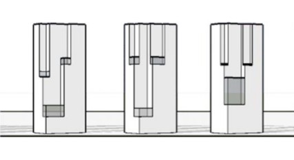 kubusvormen van lichtgrijs gaasmetaal. Aan één kant toont het een