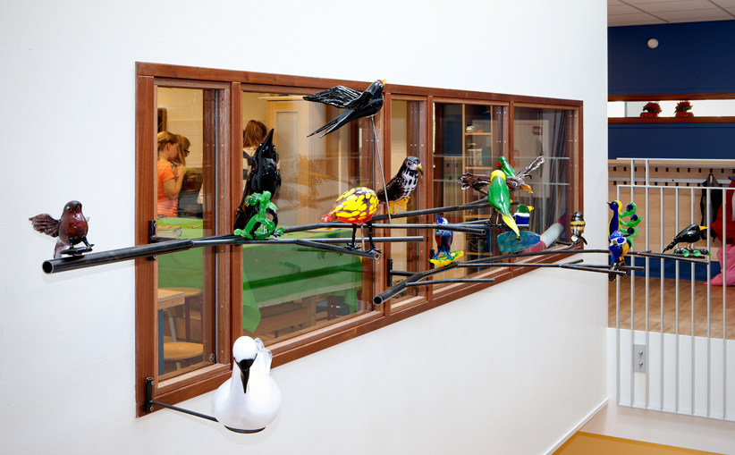 Ter kennismaking en inspiratie voor haar schoolopdracht dwaalde Maria Roosen door de Vogelwijk en las alle straatnaambordjes. Al die vogelnamen vond ze zo mooi, dat ze er een lijst van maakte. Vervolgens vroeg ze aan de leerlingen van de school (leeftijd 4 tot 11 jaar) om samen met de kunstenaars Ciel van Dooren en Liedeke Kruk tekeningen en schilderijen van deze vogesl te maken, die ze later gebruikte voor een ruimtelijke vertaling in glas. Om dat zo exact mogelijk te kunnen doen, reisde ze af naar glasblazer Jiri Pacinek in Tsjechië. Net als de door de kinderen getekende en geschilderde vogels zijn sommige kleiner, langer, dikker of platter geworden dan in het echt. Als vanzelfsprekend zitten de vogels nu op een metalen tak in de vide voor het raam van het handvaardigheids- en muzieklokaal. Het lijkt alsof de kunstenaar leven in de vogels geblazen heeft en dat de vogels (net als de leerlingen) op het punt staan om de wereld in te vliegen.