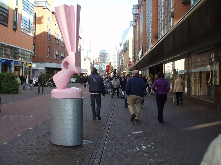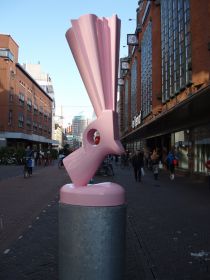 Candy pink. That is the colour André van de Wijdeven (1964) painted his sculpture when it came from the foundry. As if the gun has been covered in a thick layer of sugar, shiny and sweet. The top of the barrel of the gun forms the letters I Love JR. The text is a reference to the leading character from the 1980s American soap series Dallas. Because JR was the bad guy, it was not possible to love him. Hence the contrast in shape and colour.