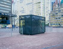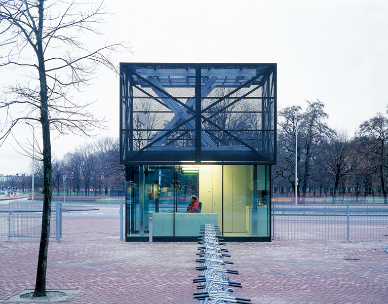 On November 21, 2003, the new bicycle guard house by Dumoffice was inaugurated on the Koningin Julianaplein in front of the Central Station. The temporary revamping of the square in front of the station asked for a bicycle shelter which could be relocated easily. The design by Dumoffice fits this request perfectly. Dumoffice has built a guard house (floor space 9 m2) made of glass with a cage on top of the roof. At night, when the shelter is closed, the cage is lowered and envelops the little building like a protective skin. Special lighting effects give the building an attractive appearance.