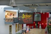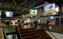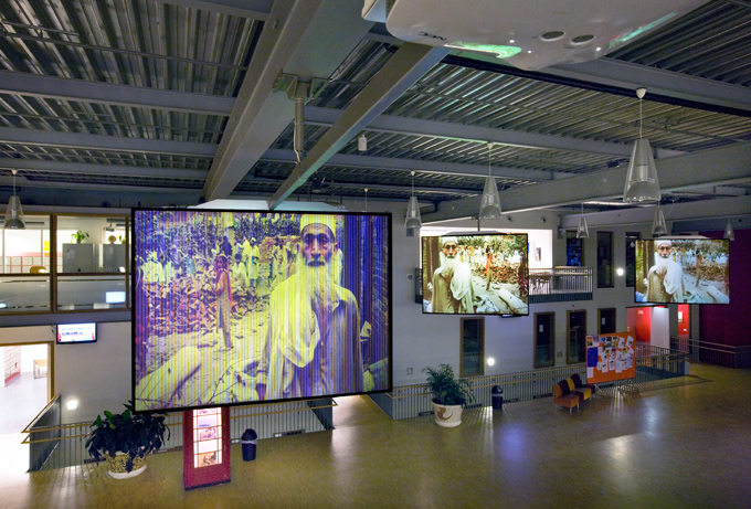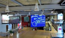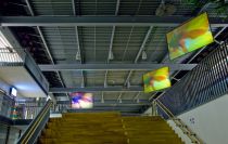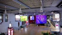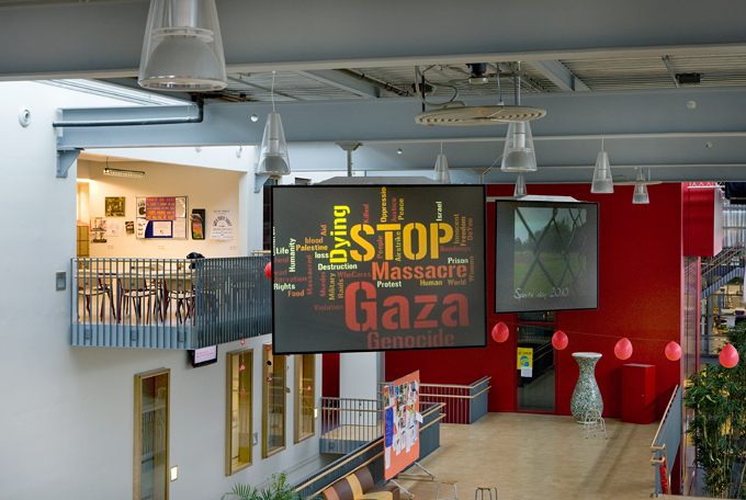 schermen opgehangen waarop uitzendingen worden geprojecteerd.