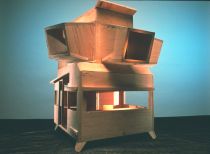 The wooden guard house by Michiel Voet in Kijkduin must compete with a snackbar it stands back to back with. Because the tiny building is much lower than the neighbour building it seems to be wearing a kind of high hat, thus emphasizing the theme of surveillance. The horns on the roof make the building look like a three-headed periscope, especially when the large, round mirror inside becomes visible. The ambiance of the wooden structure blends in perfectly well with the temporary architecture of the seaside location. The same goes for the wooden gates in this landscape of sand and dunes.