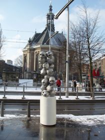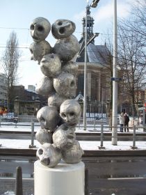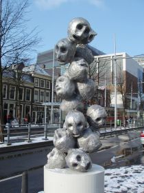 Zijn het nu schedels of aardappelachtige hoofden? Dat vraag je je af als je van een afstandje naar de stapeling aluminium vormen kijkt die op een van de sokkels in het centrum van Den Haag staat. Ook op kortere afstand blijkt dat je daar geen duidelijkheid over krijgt.