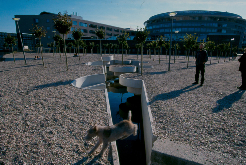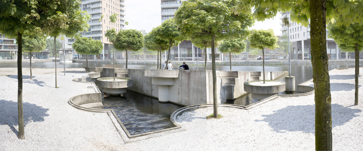 In the proposal that Vito Acconci & Studio (Luis Vera, Jenny Shrider, Charles Doherty), New York, developed, in close collaboration with the architectural offices of PRO, it appears as though a piece of land in the shape of a quarter of a circle with a radius of about 40 meters has slid out and tilted off the land. Everything on the piece of land that has broken off is taken with it, trees, street lamps and ground cover. The existing geometric pattern of planting has been disrupted with the result that trees in planters filled with soil have fallen into the water, leaving their negative forms on the quay that can be used as seating. Despite the fact that Acconci is now working in the architectonic realm, aspects from his early work can still be found, such as intimacy in relation to the public realm and the personal versus the public.