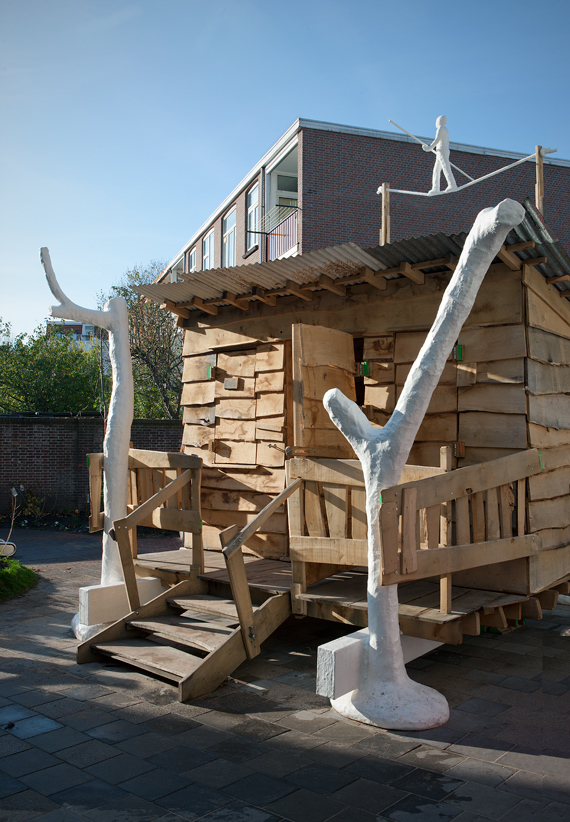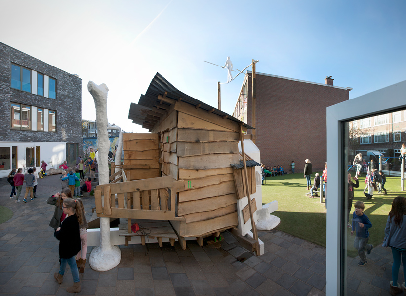 Sander Bokkinga (BOK) heeft voor beide schoolpleinen van de Valkenbosschool en Christelijke Montessori School (CMS) een bijzonder opberghok ontworpen onder de titel 'Stilstand is vooruitgang'. Het is een kruising is tussen een doorgezaagde witte caravan en een houten Flintstones hut. De scholen wilden - geïnspireerd door Fiets en Stal - een praktische toepassing voor het kunstwerk. Het schoolgebouw is door Atelier Pro ontworpen met aan beide kanten een eigen, door de ouders ontworpen (groen) schoolplein.
