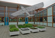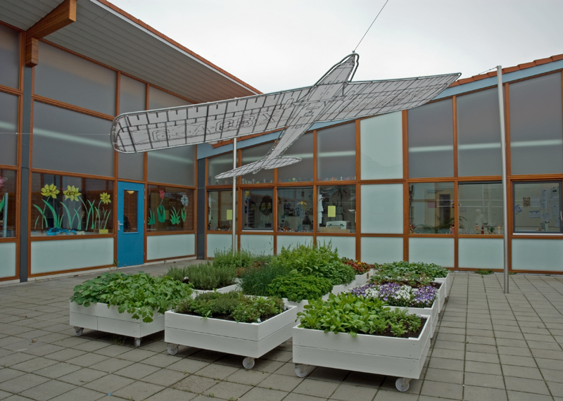 grote verrijdbare bloembakken op wielen. Het vliegtuig vormt een