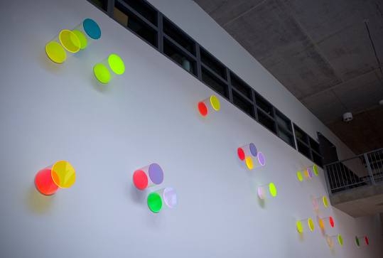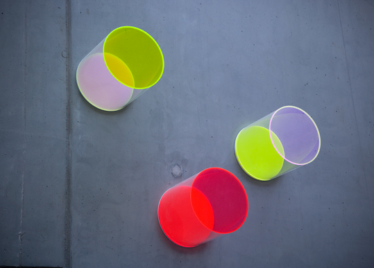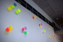 vliegende schotels; 48 gekleurde perspex ovalen die worden aangelicht