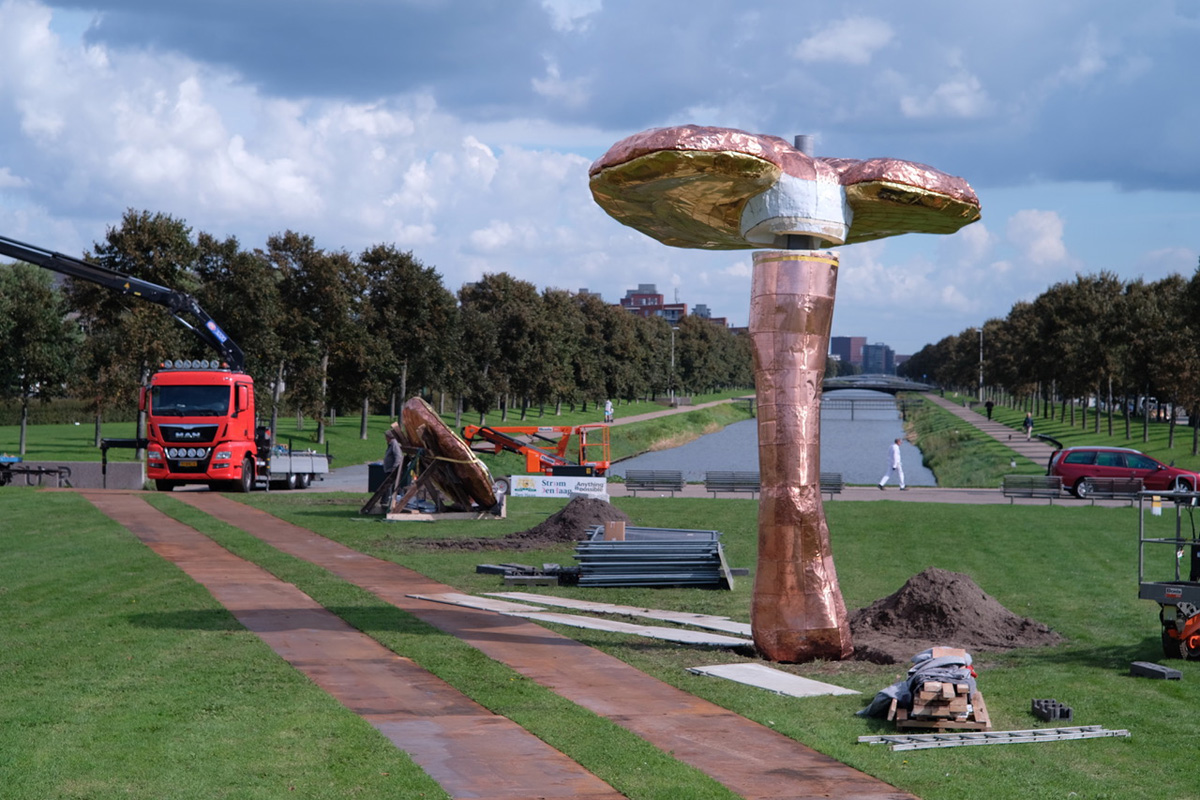 The monumental scale of Ling Zhi Helicopters called for a completely new production process, combining innovative and artisanal techniques, from 3d scans and foam processing to hammering copper. The artwork was produced and initiated in the Netherlands. The company Anything is Possible in Abcoude is responsible for the production and technical advice. Shortly before his death Huang Yong Ping visited Abcoude and was full of praise for the way his work was produced. In consultation with his widow, Shen Yuan (herself a sculptor), the artwork was completed according to the exact specifications of Huang Yong Ping.