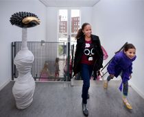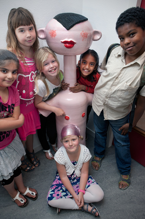 De Gantel and the Maria Montessorischool occupy one building in Wateringseveld (a suburb of The Hague). The artist Hans van Bentem had already been commissioned to design a fountain for the square in front of the school building, and consequently was also invited to create a new work of art for the schools themselves. Van Bentem wanted to use the moulds he made for the fountain as roof sculptures. In the end, however, he chose to use seven existing sculptures instead. These fashion victims had been on tour of a number of museums and galleries and were in need of a permanent location. The sculptures have been placed at various locations in the schools, with lots of children running around.