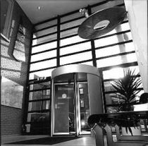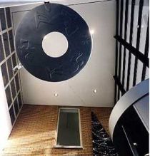 A round aluminum colored disc with a whole in the middle hangs in the lobby. A man with a bowler hat balances on the edge of the disc and looks down. Imaginary figures holding sticks and striking bells are attached in relief on the bottom of the disc. The object is linked by a cable to a two dimensional, black segment of a circle with white dotted lines and circular forms on the wall, suggesting movement.