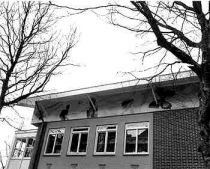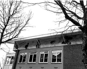 A running frieze on the outside of the building depicting the story of a boy and girl's trip around the world