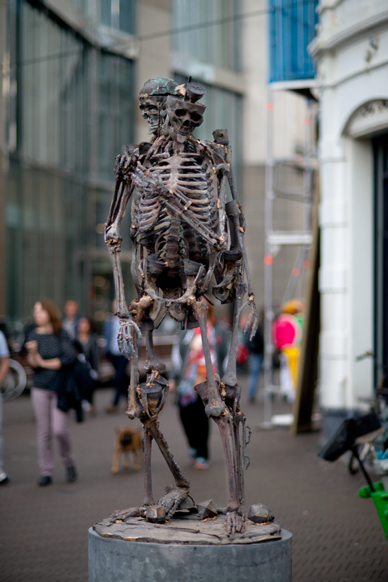 De kunstenaar zette voor het beeld twee natuurgetrouwe kunststof skeletten om in brons; symbolen voor vergankelijkheid, een belangrijk thema in de kunst van de 17e eeuw. De skeletten lijken in elkaar over te lopen, met elkaar versmolten te zijn tot één vorm. De Jong wil hiermee de letterlijkheid van de gruwelijke gebeurtenis overstijgen.