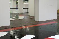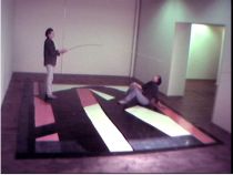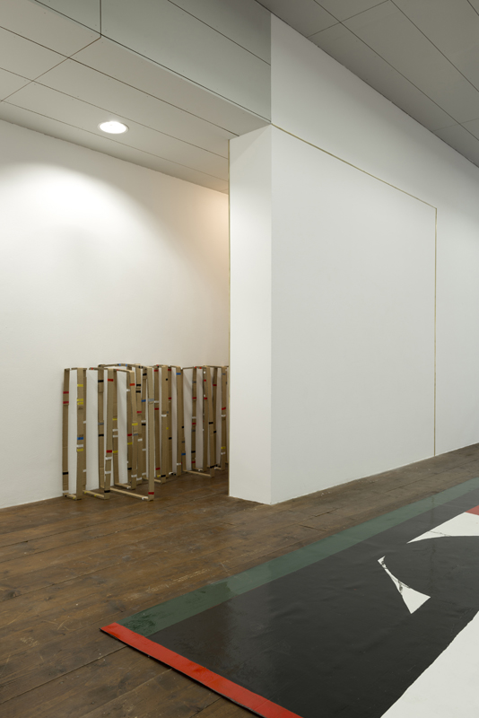 Main page Expanded Performance: click hereLeidy Churchman and MPA created the installation Painting Rooms (2012), composed of paintings and brass rods. Two paintings by Leidy Churchman on large pieces of vinyl become sculptures in this collaborative work as they lay across the floor. The window of painting is pushed down to the viewers feet and fill out the two rooms outlined by walls built to contain them. In this work where the painting is the floor and the walls are the space, the viewer will experience an amplified notion of volume within these rooms. MPA approaches performance as a potential space. Installing brass rods into corners of the room that intervene with the painting sculptures on the floor, MPA shifts focus from the performer's body and turns her attention to the possible action between the brass and paint.