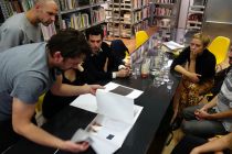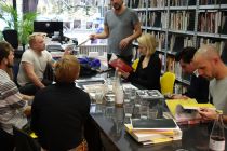 Voor deze bibliotheeksessie nam Marius Lut een tas met publicaties mee die hem hebben geïnspireerd. Vaak blijft het nieuw gekochte boek van een favoriete kunstenaar wekenlang in plastic geseald in het atelier liggen als object dat ongeopend al genoeg uitstraling heeft. Als het na een tijd geopend en ingekeken wordt, dan kan dat de aanleiding zijn om een ontwikkeling binnen zijn eigen schilderkunst radicaal te stoppen en verder te zoeken naar nog onontgonnen terreinen. Zo ontwikkelt zijn kunst zich in dialoog met, maar ook losgezongen van, het werk van bevriende en bewonderde kunstenaars. Marius liet verschillende ontwerpen voor zijn nieuwe boek zien. Voor de structuur van de publicatie heeft hij zich laten inspireren door de functies van een imaginair gebouw. Aanloopruimte, rustpunten, tijdsverloop, volume, schaal, verhouding en andere architectonische begrippen dienden als uitgangspunt voor de indeling en opbouw van het boek.