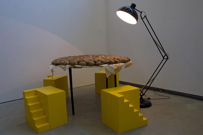 In de andere ruimte staat de Sunflower Table, een tafel gebaseerd op een grote rijpe zonnebloem waar vijf kleine mensen omheen kunnen zitten terwijl zij de zaden uit de bloem trekken. Sunflower Table onderzoekt toekomstige mogelijkheden in de relatie tussen mensen en ingrediënten. Hoe verhoud je je tot een banaan of een granaatappel als je 50 centimeter groot bent? Kunnen we ons, met behulp van dit soort objecten als de Sunflower Table, verplaatsen in een toekomstscenario waarin dit werkelijkheid wordt?