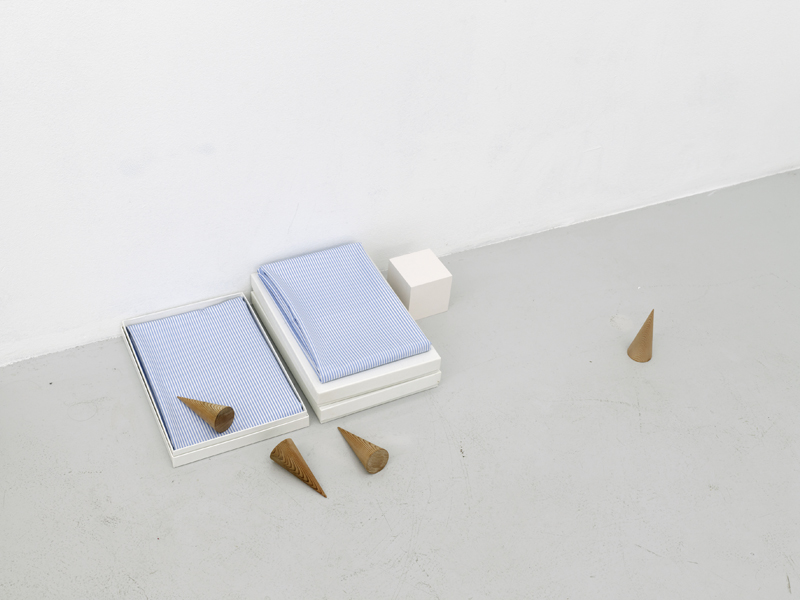 gerlach en koop, Gaan we? We gaan, 2010, drie ongemaakte overhemden, drie overhemddozen, cederhouten kegels en een kubus van mdf