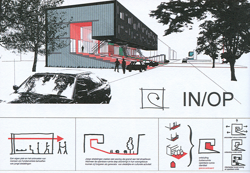De ontwerpen van de winnaar van SMART START - IN/OP - en van de andere twee genomineerden - YUM en SmartLab - zijn van 24 maart t/m 23 april te zien bij Stroom Den Haag.De Ontwerpprijsvraag van Bouwfonds MAB ‘SMART START, wonen voor de jonge stedeling' is een belangrijk instrument om zowel jonge ontwerpers te bereiken als om de hedendaagse wereld van de ruimtelijke ordening een impuls te geven. Op 23 maart maakte juryvoorzitter Jeltje van Nieuwenhoven de winnaar van deze prijsvraag bekend tijdens het SMART START-congres in het Museum voor Communicatie. Het winnende ontwerp IN/OP, ingezonden door Thomas Gillet, Michel Heesen, Kobbe Nouwens en Micha de Haas wist de jury te overtuigen door het fascinerende ontwerp. "De straat wordt het gebouw ingetrokken, het ‘exhibitionisme van de jonge stedeling' komt bij dit ontwerp naar voren. Het gebouw is geslaagd vanwege de ‘koppigheid van het gebouw', de ruimtes die het biedt en de onverwachtse kwaliteiten. Het wordt een veelbelovend, professioneel en aantrekkelijk ontwerp gevonden. Een icoon waar de jonge stedeling zich thuis kan voelen dat anders en spannend is", aldus een zinsnede uit het juryrapport. IN/OP ontvangt een prijzengeld van € 15.000. Bovendien heeft Bouwfonds MAB Ontwikkeling de intentie uitgesproken het winnende ontwerp te realiseren. De gemeente Den Haag heeft daarbij de voormalige bioscoop op de hoek van de Leyweg en de Hengelolaan in Den Haag Zuid West aangewezen als voorlopige studielocatie.