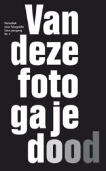 Van deze foto ga je dood : Periodiek voor fotografie nummer 1 / door Anne Geene, Arjan de Nooy, David de Jong, Sander Uitdehaag, Vincent van Baar. - Den Haag : Salvo, 2013. - 80 p. : ills. ; 20 cmPeriodiek voor fotografie met een wisselend formaat en steeds een ander thema. Dit eerste nummer gaat over de vergelijking tussen het schieten door de fotograaf en het neerschieten van iemand. Hoeveel tijd heb je wanneer je een kogel in een parallelle baan aan het aardoppervlak (precies tussen alle bergketens door) zou kunnen afschieten die nooit in vaart mindert totdat 'ie op het punt terug is waarvandaan 'ie vertrok (totdat 'ie zich ergens in je rug zou boren)? Heb je tijd om je om te draaien? Heb je tijd om een foto te nemen?