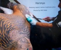 Kenichi Kato, who works under the name of Horimyo, works close to tradition. He's one of the rare tattoo artists to work only with Tebori style, where all tattoos from start to finish use a traditional needle on a bamboo pole as opposed to tattoo gun. It's a difficult technique, the needles are all handmade, as are the inks made from charcoal, the process is quite painful, but the results are stunning. The roots of tattooing in Japan did not start with organized crime, like many people assume, but come from an art form that was believed to bestow powers onto those who bore tattoos.