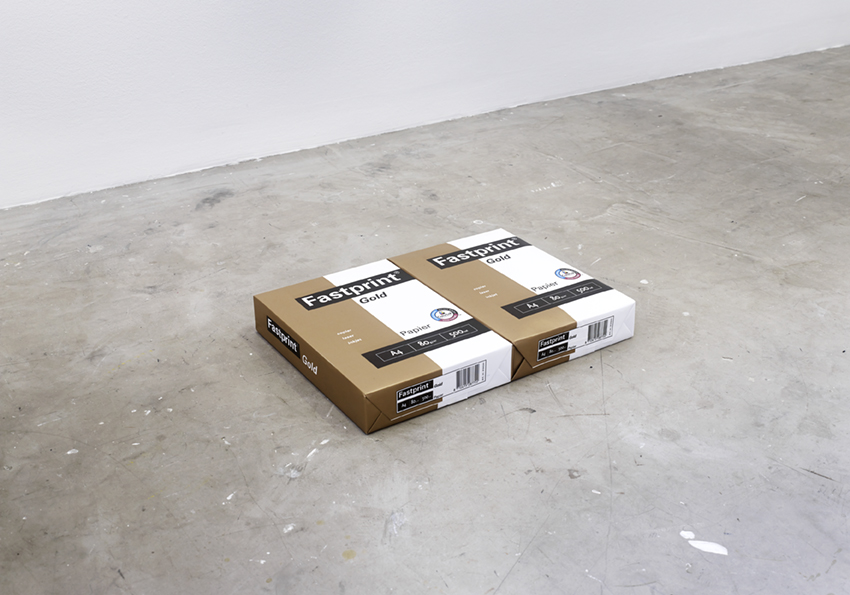 In the exhibition they show existing, new and selected works. The Two Pages from 2010 consists of an unopened pack of copying paper of which the wrapping has been copied onto the fivehundred sheets of a second pack that has subsequently been rewrapped.