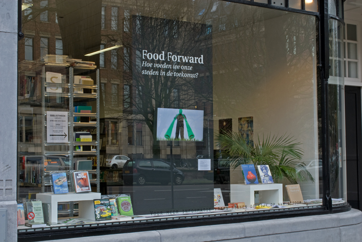 Additionally to the exhibition Food Forward in the window of the Stroom library the video 'Designs for an Overpopulated Planet: no. 1 Foragers' by Dunne & Raby is shown.