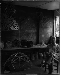 R. Buckminster Fuller surrounded by study models from his teaching and research, Black Mountain College, 1949